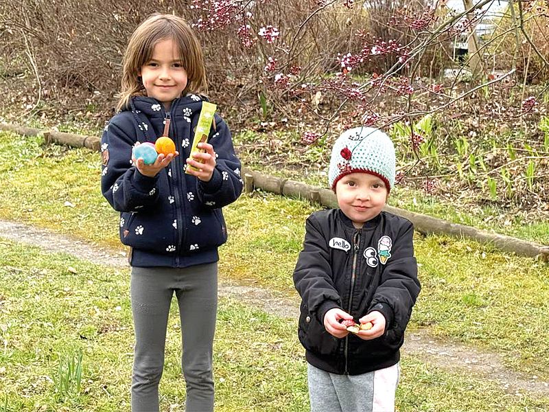 Jollie und Alex staunten: »Der Osterhase ist ja ein richtiger Schmusehase, den man anfassen kann.« Beide schmiegten sich glücklich an den Bauch des Hasen.
